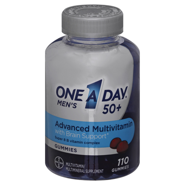 Product Details. As we get older, we have different health concerns when it comes to both our minds and bodies. That's why One A Day Men's 50+ Advanced Multivitamin with Brain Support Gummies are specially formulated for men over 50 with a super 8 B Complex to help support healthy brain function.*. Rich in all 8 B Vitamins, this.