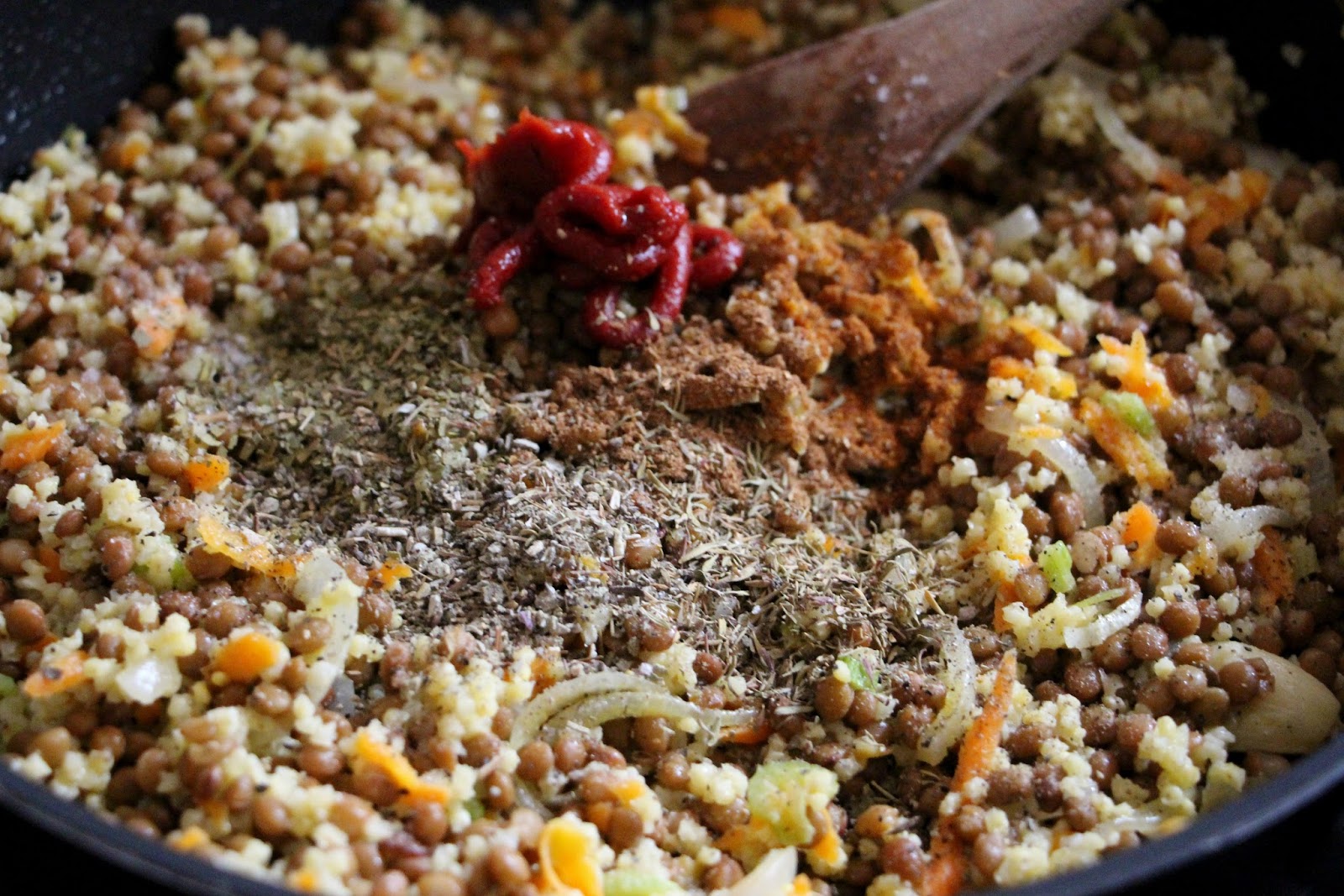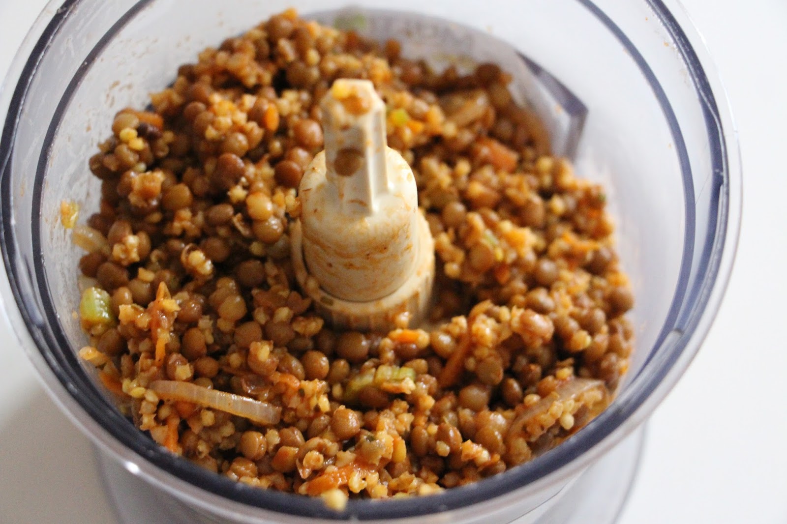 Préchauffer le four à 350°F (180°). Dans une poêle, chauffer l'huile et y faire caraméliser l'oignon. Ajouter carotte et ail et cuire 2 minutes. Dans la cuve du robot culinaire, mettre les flocons d'avoine et pulser quelques coups. Ajouter les lentilles et pulser sans réduire en purée ( on gardera un peu de texture).