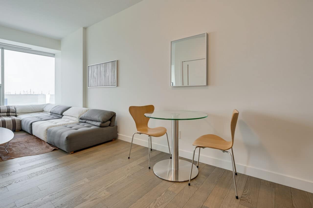These 1-bed + den, 1-bath suites are adorned with stainless steel appliances, quartz countertops, and modern furnishings. Embrace the convenience of in-suite laundry and a 65″ smart TV. Your workspace awaits for efficient remote work. The bedrooms boasts a queen bed and ample closet space. Indulge in the spa-like bathroom with upscale.
